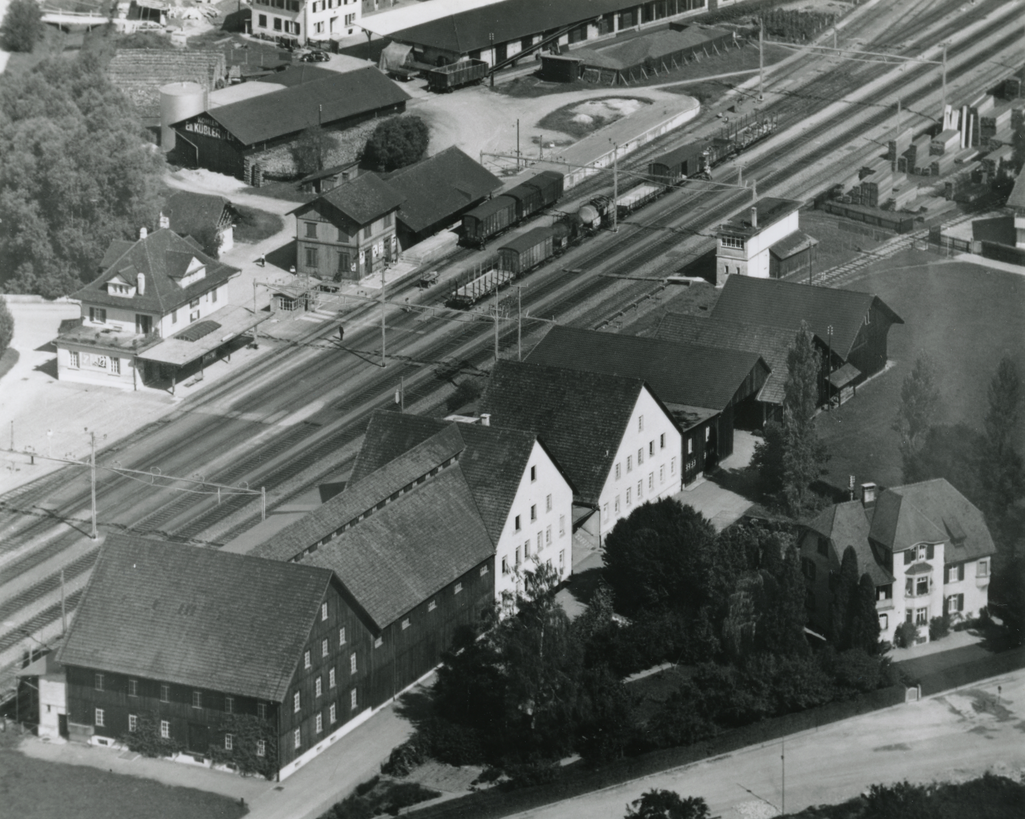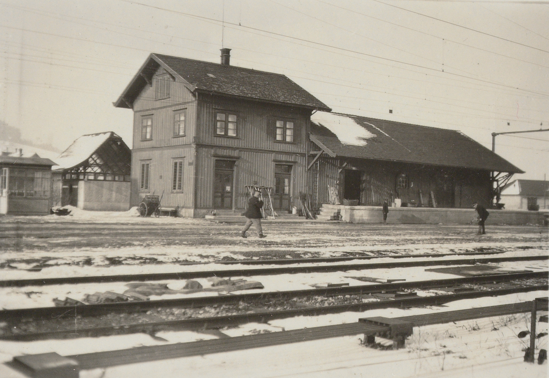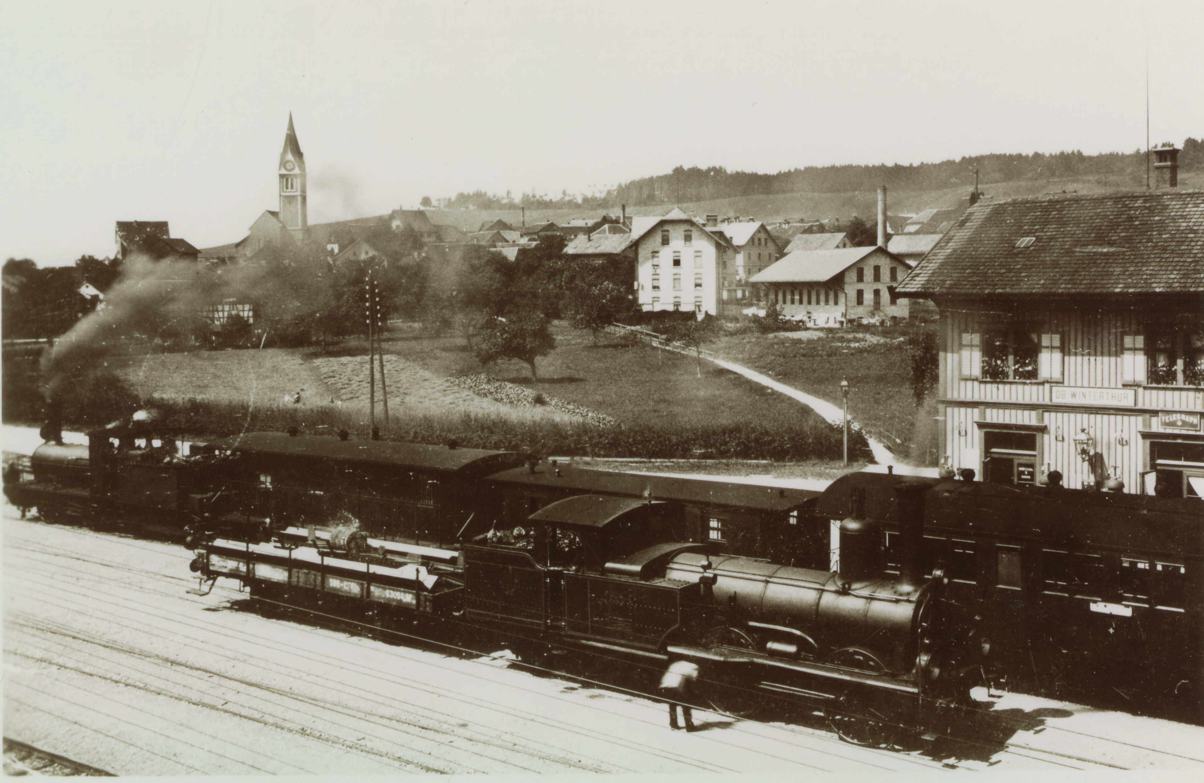 1855 eröffnete die Nordostbahn die Linie Zürich-Winterthur-Romanshorn. In Oberwinterthur hielt der Zug nicht an. Damals hatte die Gemeinde Oberwinterthur noch keinen Bahnhof. Gut zwanzig Jahre später eröffnete die Schweizerische Nationalbahn eine weitere Linie, die Oberwinterthur passierte: die Strecke von Winterthur nach Etzwilen, Singen und Konstanz. Mit der neuen Zuglinie wurde 1875 das erste Bahnhofsgebäude in Oberwinterthur errichtet. Das einfache Stationsgebäude mit Schalterraum für den Billetverkauf, einer Wohnung und einem Güterschuppen baute Cornard Bär.