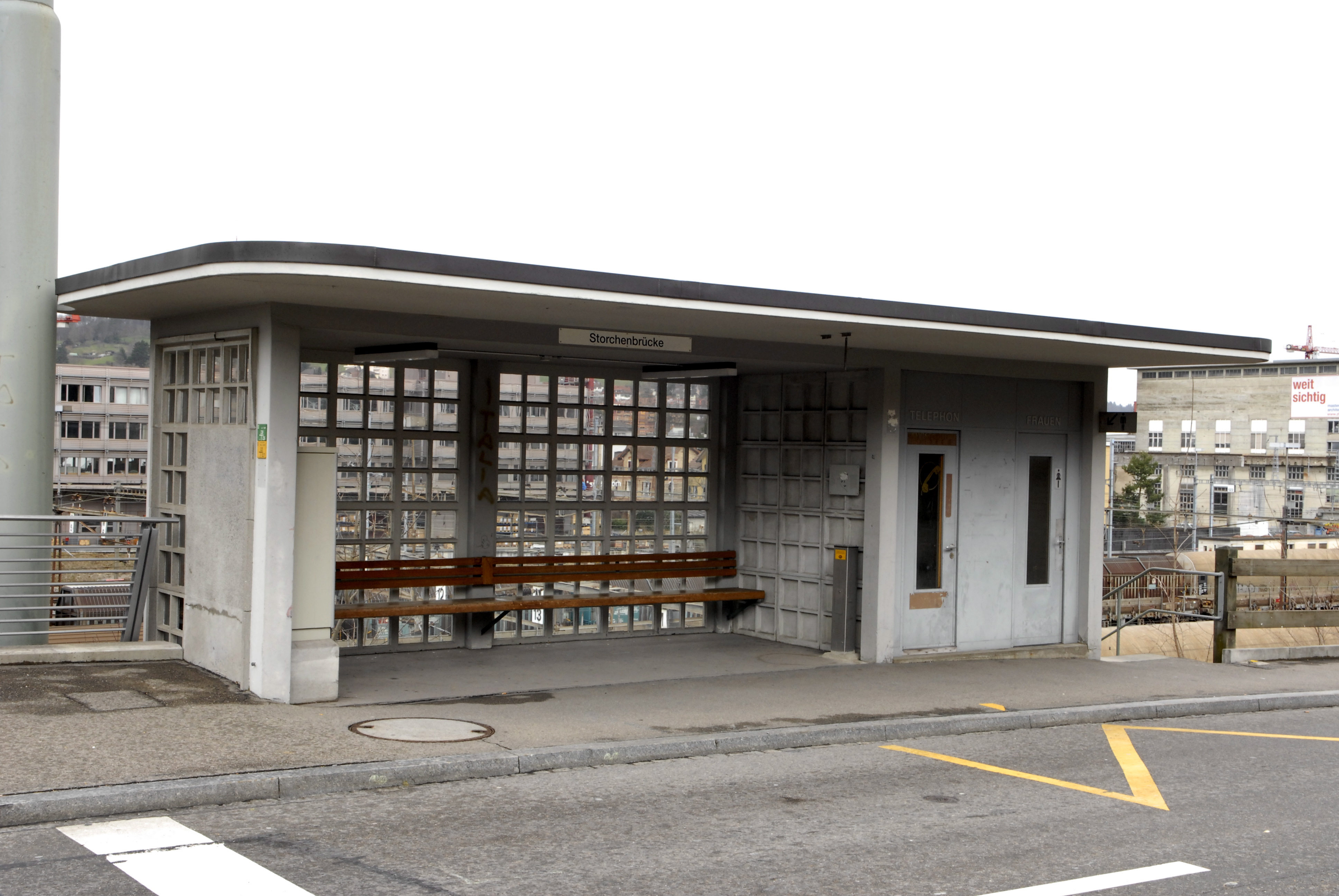 Architekt Reinhart Arthur Hermann (1895-1993) war von 1941 bis 1960 Winterthurer Stadtbaumeister. Auch er war, wie viele seiner Berufskollegen seiner Zeit dem „Neuen Bauen“ verpflichtet. Dies fand auch in der Konzeption der Buswarte-Häuschen seinen Niederschlag. Drei davon konnten sich ins 21. Jhdt. retten. Das Unterstand-Gebäude an der Ecke untere Vogelsangstrasse/Storchenbrücke wurde 2009 unter Schutz gestellt. Es soll, da noch sehr gut erhalten, als „Baudenkmal“ erhalten bleiben.