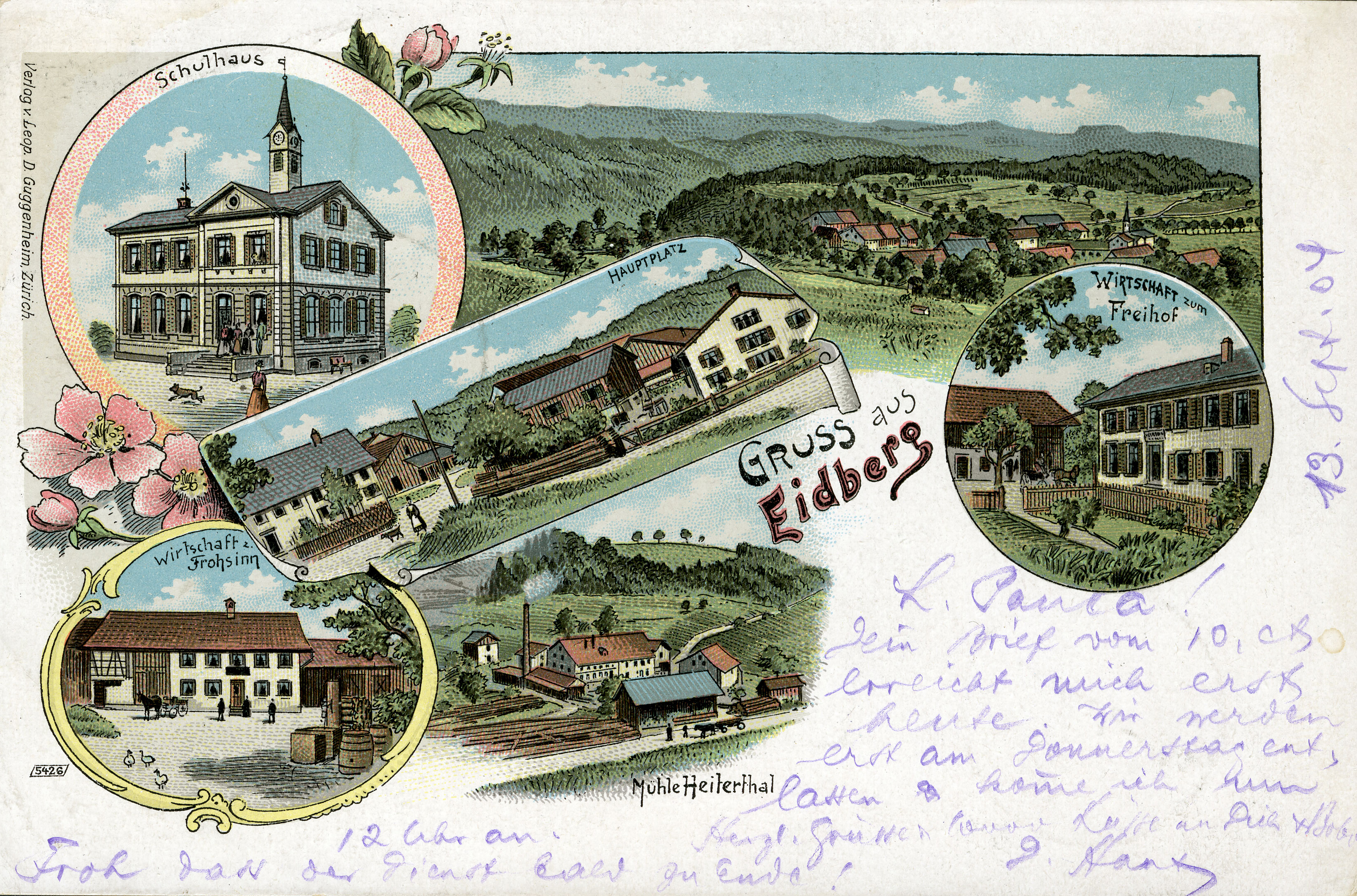 1904: Eidberg: Schulhaus, Hauptplatz, Wirtschaft zum Freihof, Wirtschaft zum Frohsinn, Mühle Heiterthal. Sammelansicht mit handschriftlichem Text