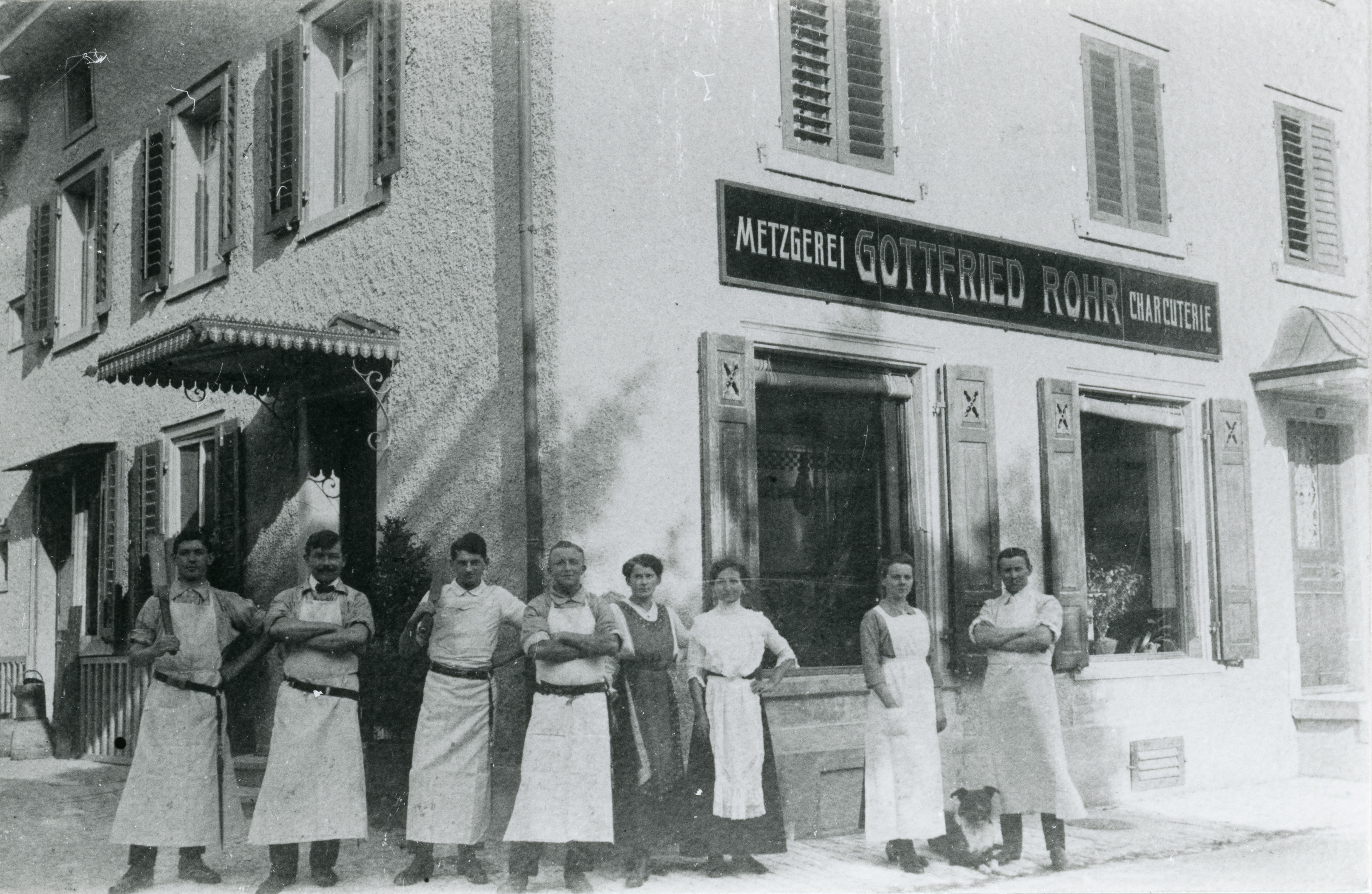 Im Strassenzug folgten die Wirtschaft Jägerhaus; der Milchladen Ernst; „dä Chämifäger“ Josef Meienberg; die Rosenapotheke und daneben an der Schützenstrasse der Milchhändler Max Ladtmann. Zum Abschluss der „Aufzählerei“ darf auch das Wirtshaus zum Frohsinn nicht fehlen. Der Verdrängungskampf hat seine Früchte getragen… Geblieben sind die Gastbetriebe Konkordia und Nachbarsgarten (früher Jägerhaus) und die Old Timer Bar, (früher Frohsinn, abgerissen anno 1940.) Vis-à-vis gibt es heute das Spezialgeschäft La Romagnola (früher Möbel Bloch).Positiv ist aber, dass die Feldstrasse noch ein Coop-Center und eine der letzten Privatmetzgereien; Lotti, vormals Rohr, bzw. Jäger sen. und jun. besitzt. Nicht einmal unser „Schmidäbärgli“ gibt es noch, wo wir früher schlittelten. Auf dem Hof vom „Buur“ Schmid, wo früher Kühe weideten und Hühner gackerten, steht heute die Schulhausanlage Feld. Warum weiss Erwin Grieshaber das alles? - Er sagt: "Ich bin „Vältemer“ und habe eine einfache, aber schöne Jugend -und Schulzeit zwischen den „Crèmeschnitten“ vom „Beck Honegger“ und dem „Traubensaft vom VOLG“ erleben dürfen".