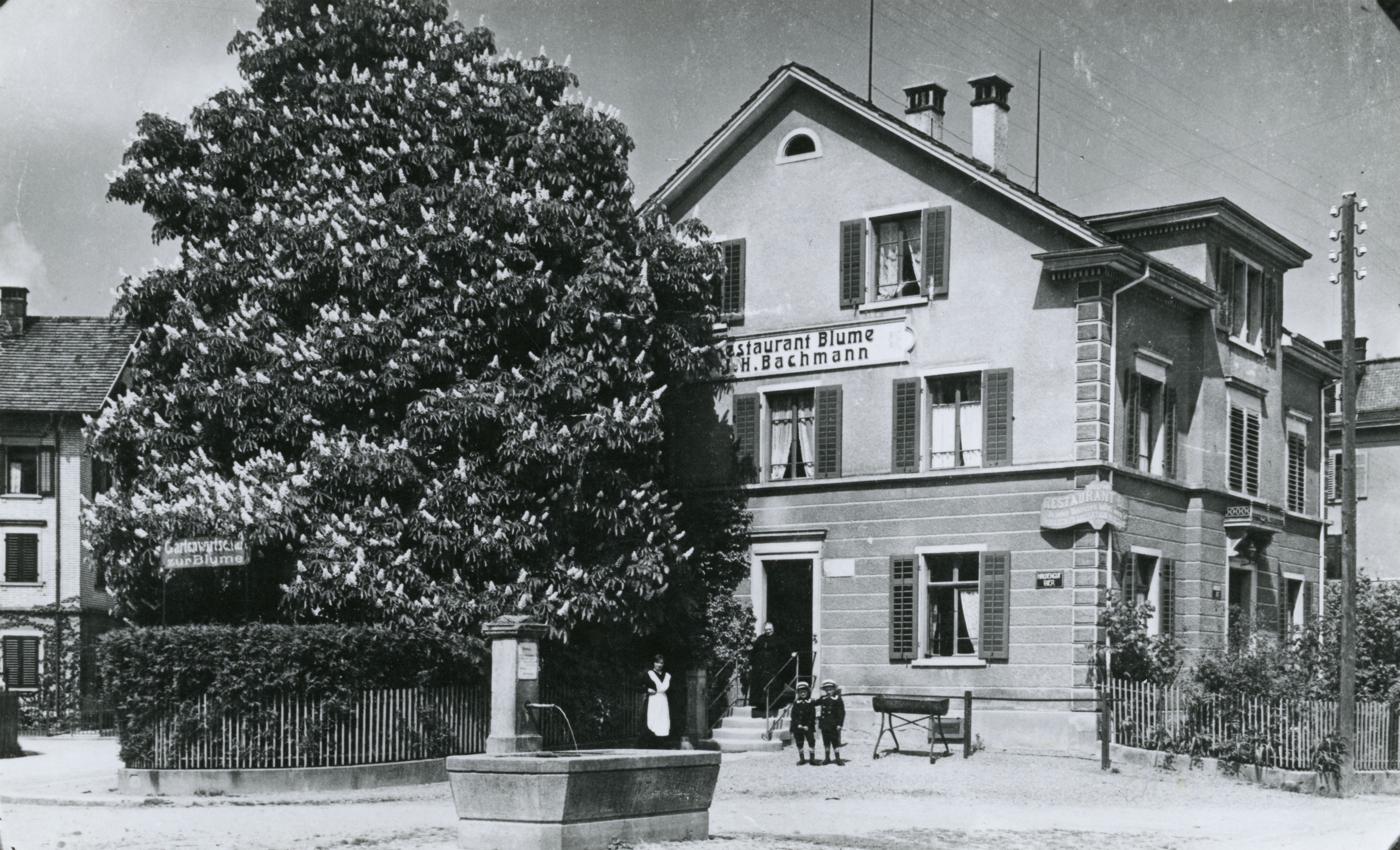 Ennet der Schaffhauser-Bahnlinie Oettli-Ahl, Holz und Kohle; Transport- und Busbetrieb (erster Busbetreiber ins Breite-Quartier ab 1940 und weil Benzin rationiert war, mit Holzvergasermotor).Nach der Rechtsbiegung Velohändler Fliegans und „dä Metzger Rohr“. Und zum Abschluss ein weiterer „Konsi“ direkt gegenüber der Konkordia. Von der Bachtelstrasse zurück zur Wülflingerstrasse, wieder auf der rechten Seite Das Restaurant Konkordia mit dem Wahrzeichen, dem rustikalen Dorfbrunnen davor, der seit 1823 friedlich vor sich hin plätschert, der Schuhhändler Pfomann, der Gemüse-und Früchtehändler Anner und die Fuhrhalterei Haidorfer, die u.a. auch den Kehricht mit Ross und offenem Wagen abholte (der Geruch liess grüssen).