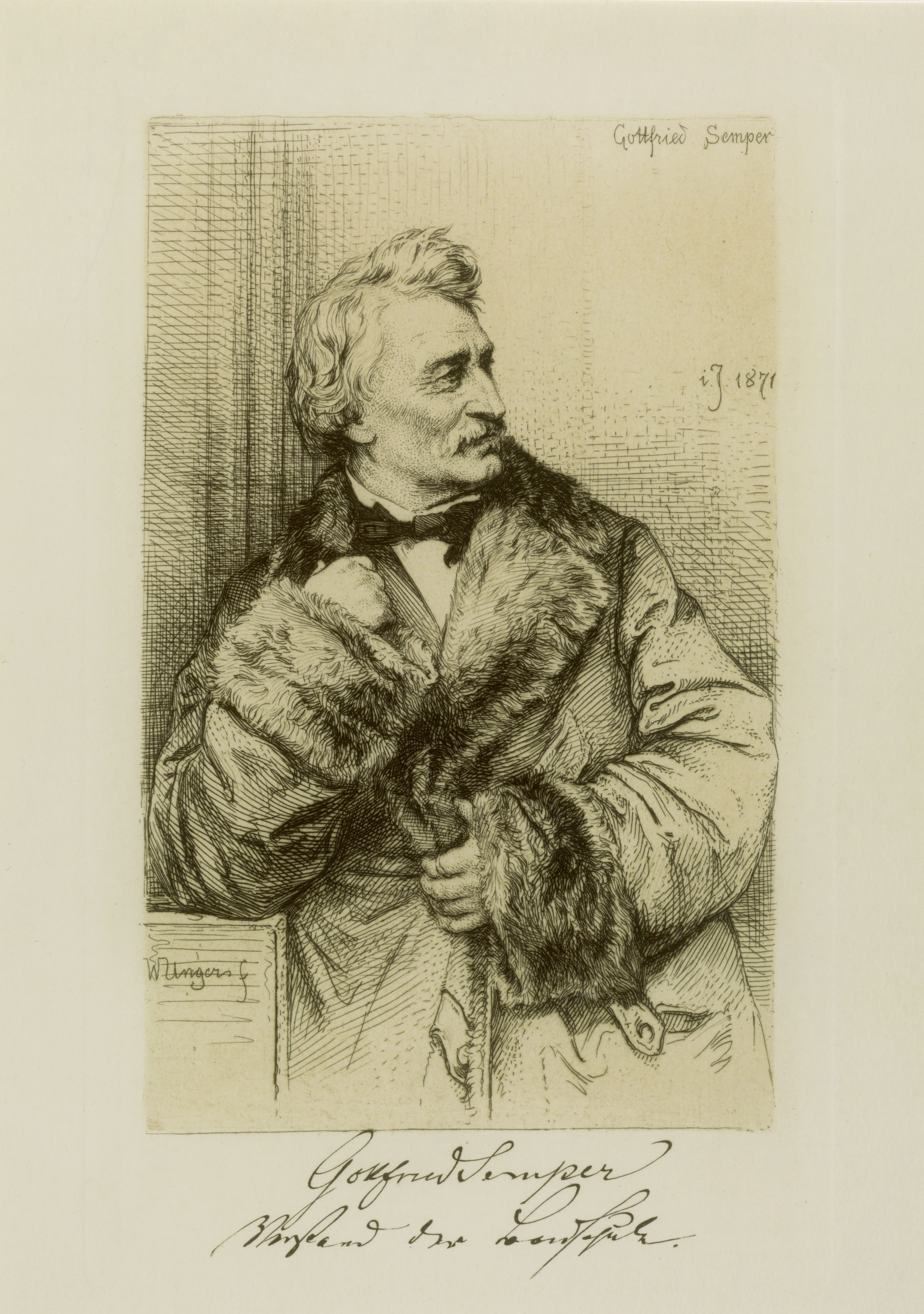 Gottfried Semper wird am 29. November 1803 in Hamburg-Altona geboren und wächst in finanziell sicheren Verhältnissen auf. Er studiert Mathematik in Göttingen und schreibt sich 1825 für das Architekturstudium an der Kunstakademie in München ein. Ein Jahr später reist er nach Paris. Er arbeitet mit Unterbrechungen im Atelier des kulturell sehr interessierten Franz Christian Gau. Nach der Juli-Revolution 1830, mit der Semper sympathisiert, bricht er im Herbst zu einer dreijährigen Studienreise nach Italien und Griechenland auf. Die Ergebnisse seiner Studienreise veröffentlicht er 1834 in seiner Schrift "Vorläufige Bemerkungen über bemalte Architektur und Plastik bei den Alten". Die darin vertretene Ansicht, die Bauten und Plastiken der Antike seien nicht, wie bisher angenommen, marmorweiss, sondern farbig gewesen, greift in die aktuelle Debatte um die Farbigkeit antiker Architektur ein. Der Pariser Akademiestreit wird zu Gunsten eines neuen Antikenbildes entschieden. Im selben Jahr ernennt ihn das sächsische Ministerium des Innern zum Professor für Architektur und Vorsteher der Dresdner Kunstakademie. In Zusammenhang mit seiner Lehrtätigkeit entstehen die Ansätze zu seinem umfangreichen theoretischen Werk. Vor allem aber ist er praktisch tätig. Infolge seiner aktiven Beteiligung am Mai-Aufstand 1849 in Dresden muss er fliehen. Über Paris kommt er nach London, wo er das Manuskript "Die vier Elemente der Baukunst" abschliesst. 1852 erhält er eine feste Anstellung als Lehrbeauftragter am Department of Practical Art. Dort erreicht ihn ein Schreiben Richard Wagners, das von einer möglichen Tätigkeit Sempers am neu gegründeten Polytechnikum in Zürich berichtet. Am 7. Februar 1855 ernennt der Schweizer Bundesrat Semper zum Professor auf Lebenszeit.