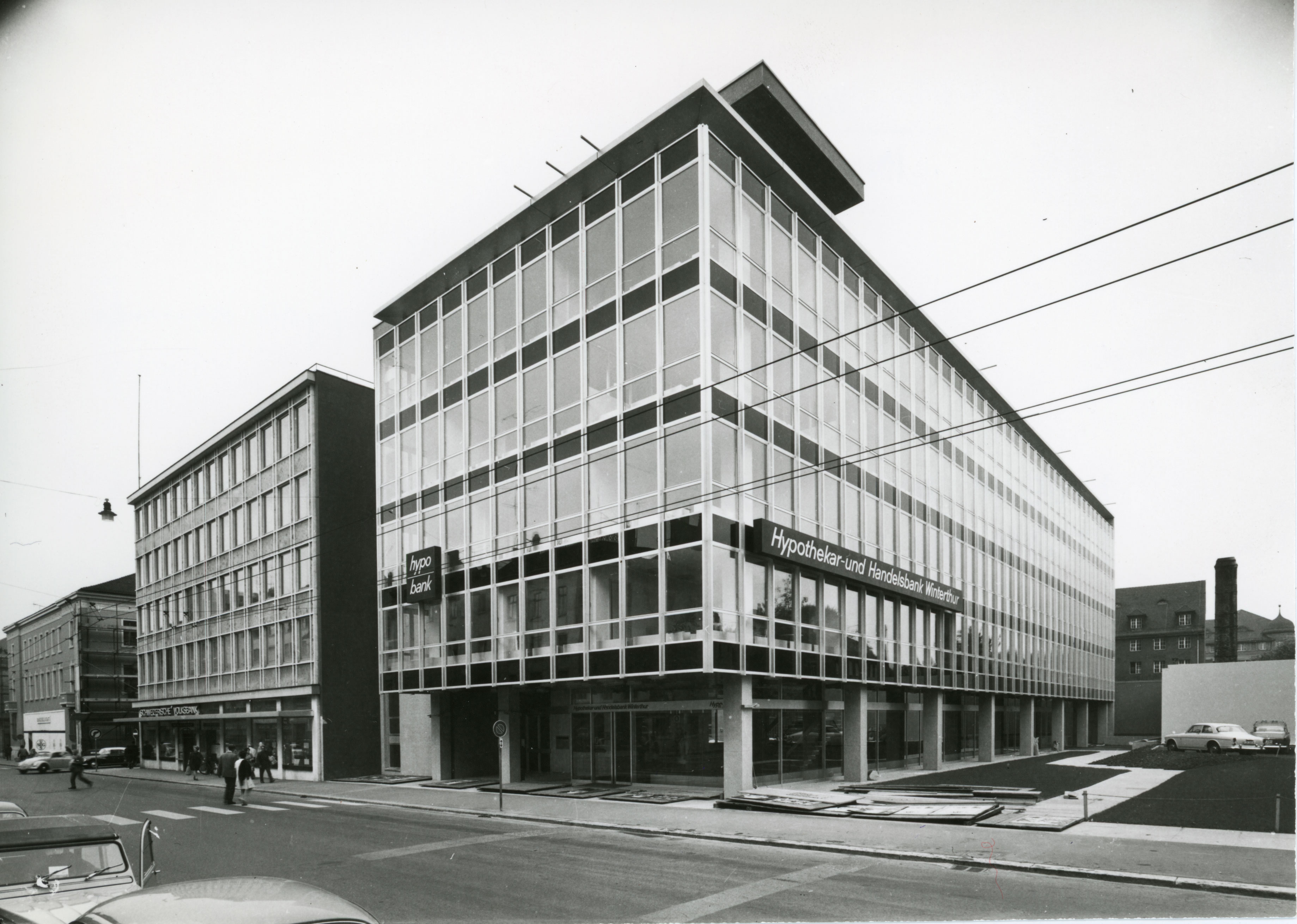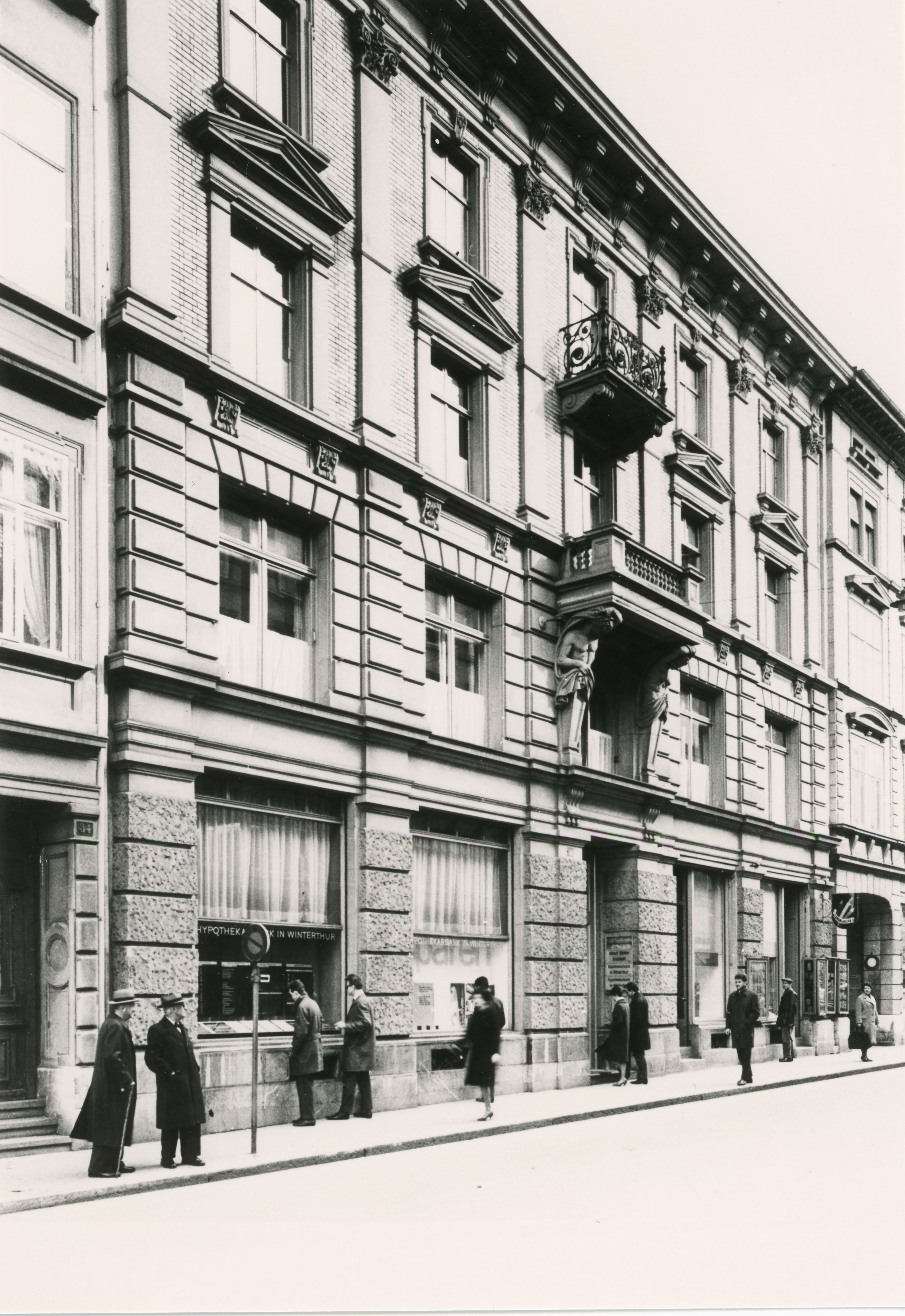 Dass dieses grossartige Gebäude 1970, knapp hundert Jahre später einem nüchternen Neubau weichen und damit kurz vor der Neubewertung der Baukunst des „Fin-de-siècle“ eine Bresche in den so einheitlichen Baublock schlagen musste, ist sehr bedauerlich. Doch waren die gesetzlichen Instrumente damals noch zu stumpf, um einen solchen Eingriff abzuwenden. Die restlichen Bauparzellen am Untertor, am Bahnhofplatz und an der Stadthausstrasse (damals noch Museumstrasse) wurden gleichzeitig mit der Hypothekarbank überbaut. In den Jahren 1964-1968 baute die Hypothekarbank an der Stadthausstrasse 14 ein sechsgeschossiges Büro- und Bankgebäude. Die allseitig verglaste Fassade mit bis zum Boden reichenden Fenstern wirkt, zusammen mit dem Material- und Farbenspiel leicht und elegant. Architekt war Roland Rohn aus Zürich. Im Januar 1989 wurde die Hypothekarbank von der „Winterthur“ übernommen (Mehrheitsbeteiligung durch Aktien Übernahme von der SBG). Es war das erste Mal, dass einer schweizerischen Versicherungsanstalt gestattet wurde, die Kontrolle einer Bank zu übernehmen. Die Bilanzsumme betrug 1987 knapp 1,5 Mia. Franken. Das Manöver bedeutete ein erster Gehversuch in Richtung Allfinanz. Die Hypothekarbank konnte die Erwartungen nicht erfüllen. Das Kreditportefeuille hatte nicht die Qualität, die nötig gewesen wäre. Das spezialisierte Bodenkreditinstitut war in den 1990er-Jahren enorm von der Immobilenkrise betroffen.