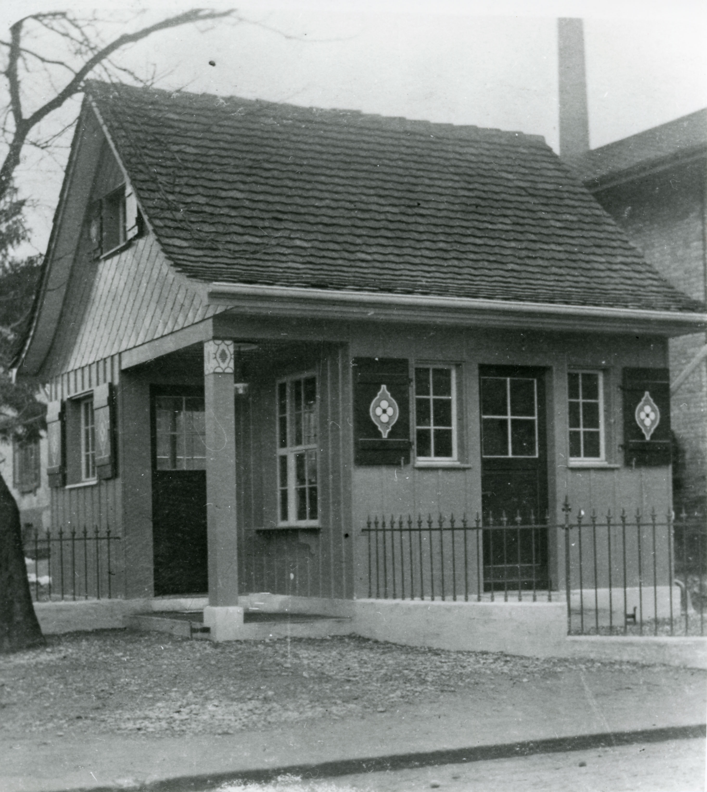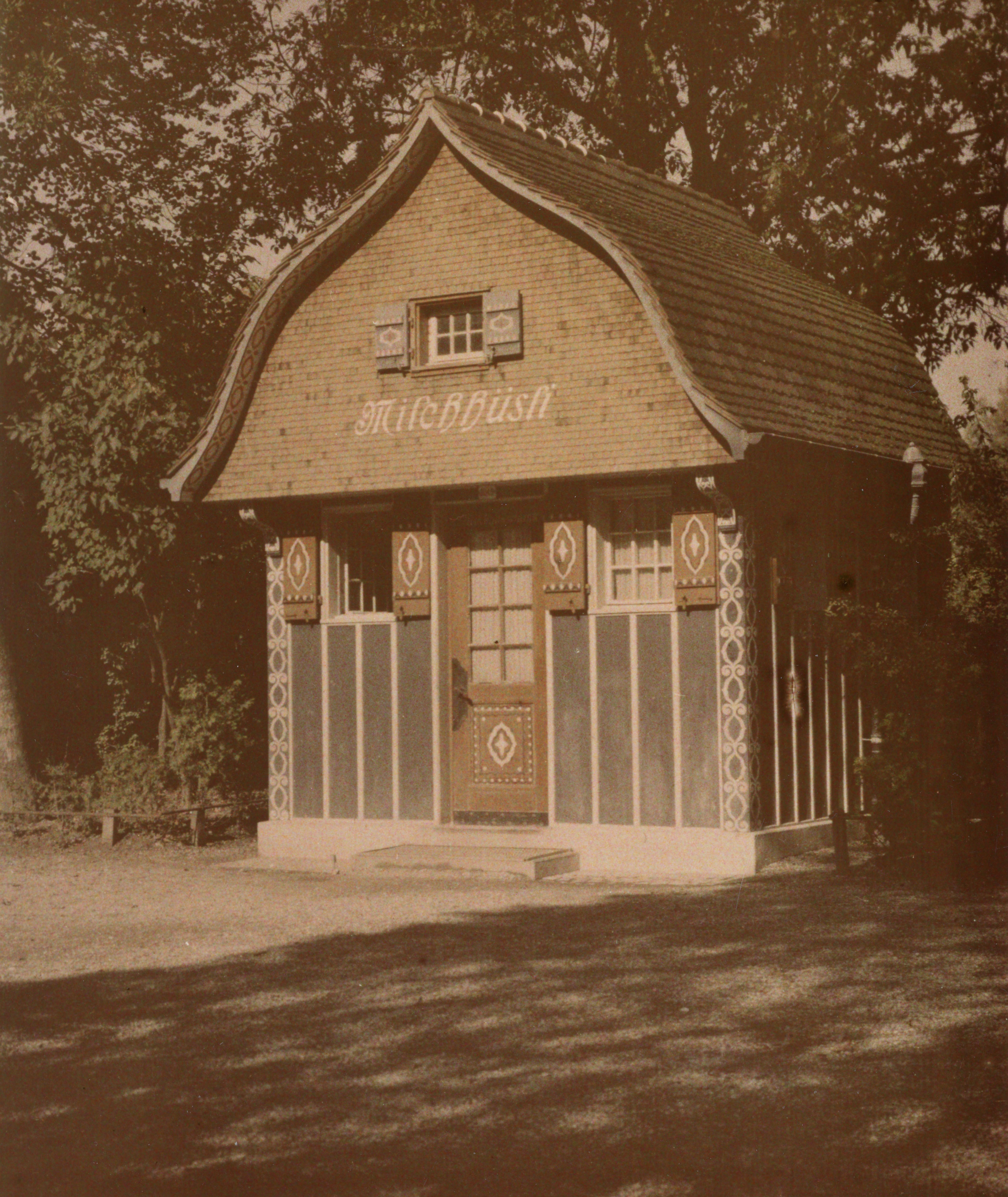 Der unscheinbare kleine Bau neben der Reithalle am Reitweg hat eine grosse Vergangenheit: Er war das Milchhüsli, das von 1914 bis 1940 im Stadtgarten Milch verkaufte. Unter der braunen Farbe verbirgt sich eine hübsche Dekorationsmalerei. Leider hat sich der Bau seiner militärischen Nachbarschaft angepasst und seinen Charme ziemlich eingebüsst. Nur die elegante Dachform weist noch darauf hin, dass er von guten Eltern stammt: Er wurde von den Architekten Fritschi und Zangerl entworfen, die in Winterthur mehrere repräsentative Stadthäuser bauten. Der Konsumverein Winterthur errichtete das Milchhüsli im Stadtgarten 1914 auf Anregung des Bundes abstinenter Frauen neben dem heutigen Museum Oskar Reinhart, damals noch Knabenschule.