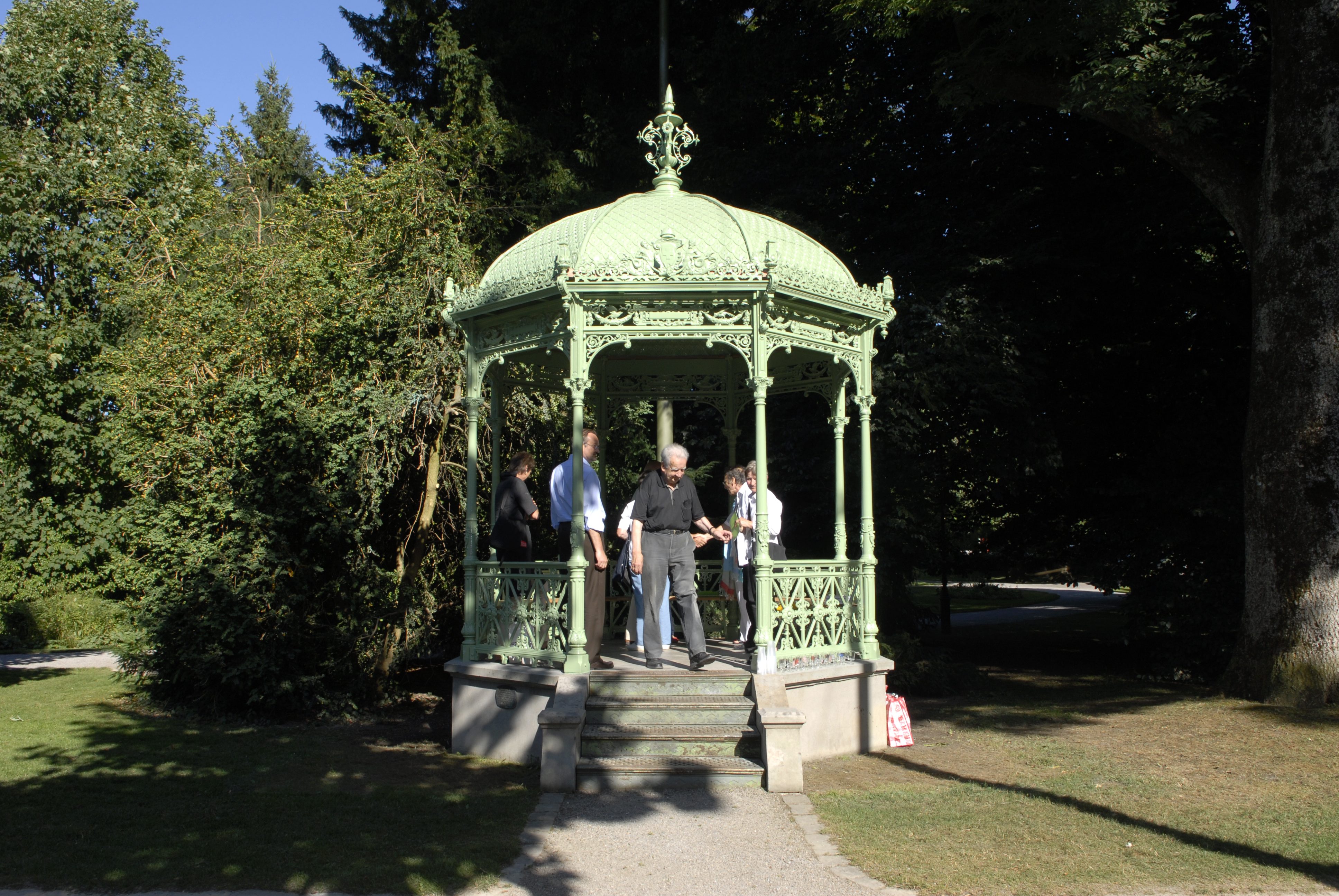 Die plastische Seite mit Blumen und barocken Rankenornamenten ist gegen aussen gerichtet, die flache gegen innen. Die acht gusseisernen Säulen weisen über quadratischen Podestchen einen Schaft mit jugendstilartiger Blätterbasis und über dem Simschen auf Geländerlaufhöhe Rundsäulen, mit zweiseitigem Girlandenschmuck, eine ovale Spiegelform zierend, auf. Über einem Kompositionskapitell setzt sich die Säule mit quadratischem Querschnitt fort. Durchbrochene gusseiserne Bugdreiecke mit pflanzlichen Ornamenten bilden den korbbogen-förmigen Öffnungsabschluss. Der Dachaufbau zeigt im Gebälkbereich den klassischen Aufbau mit Fries, Kranzgesims und kleinen Aufsätzen, der durchbrochene Fries mit Pflanzen- und Vogelornamenten umfasst nicht beschriftete Schildchen. Das Kranzgesims ist über dem Eingang und auf den beiden Seiten des Achtecks mit je dieselben Allegorie geschmückt. Zwei bärtige Tritonen mit verschlungenen Fischschwänzen scheinen auf Meeresgirlanden und festem Handgriff das Schweizerwappen über dem Abgrund hochzuhalten. Das umrankte Wappen ist von einer Königskrone überdeckt. Die Dachhaut ist mit acht Blechen zur Kuppel geformt, es ist so ornamentiert, dass eine Art Biberschwanzziegelstruktur entsteht.