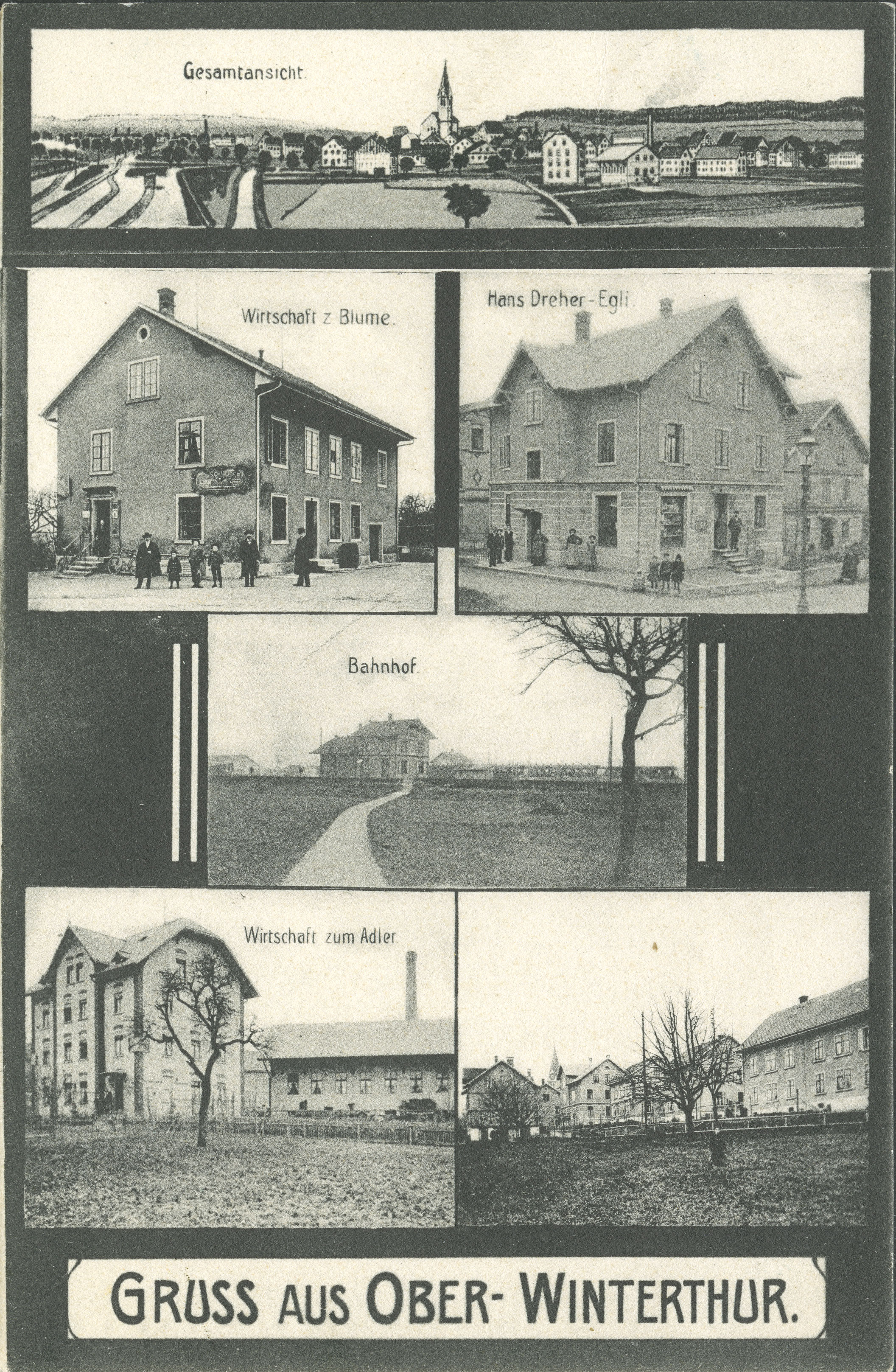 1906: Oberwinterthur Gesamtansicht, Sammelansicht mit Gesamtansicht, Wirtschaft zur Blume, Hans Dreher-Egli, Bahnhof und Wirtschaft zum Adler
