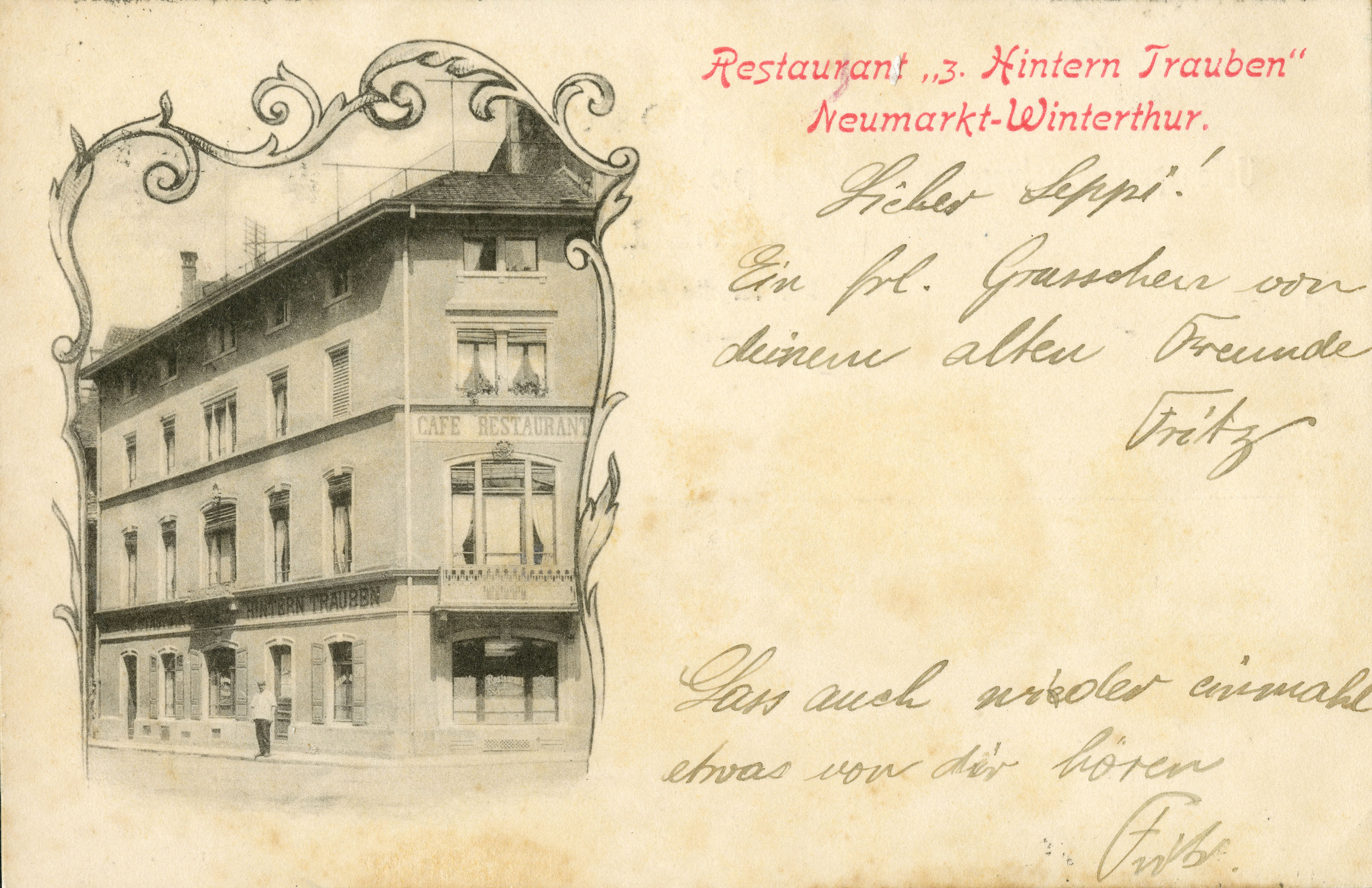 „Gömmer no ist Trüübli?“ Kaum jemand, der in Winterthur nicht wüsste, dass mit diesem Vorschlag zum Schlummertrunk das Restaurant an der Bosshardengasse beim Neumarkt gemeint ist, eines der renommiertesten Lokale der Stadt. Und wohl auch eines der ältesten. Gemäss einem Verzeichnis der Winterthurer Gastbetriebe wurde das „Wirtshaus zur Traube“ am Untertor 1785 in einem Stadtratsprotokoll erstmals erwähnt. Knapp neunzig Jahre später, 1874, kam im hinteren Teil des gleichen Gebäudes das „Restaurant zur hinteren Trauben“ hinzu. Auf alten Fotografien von Anfang des letzten Jahrhunderts ist zu erkennen, dass sich dabei auch im ersten Stock ein Speisesaal befinden musste. Viel mehr lässt sich zur Geschichte des Wirtshauses aus jenen Jahren leider nicht finden.