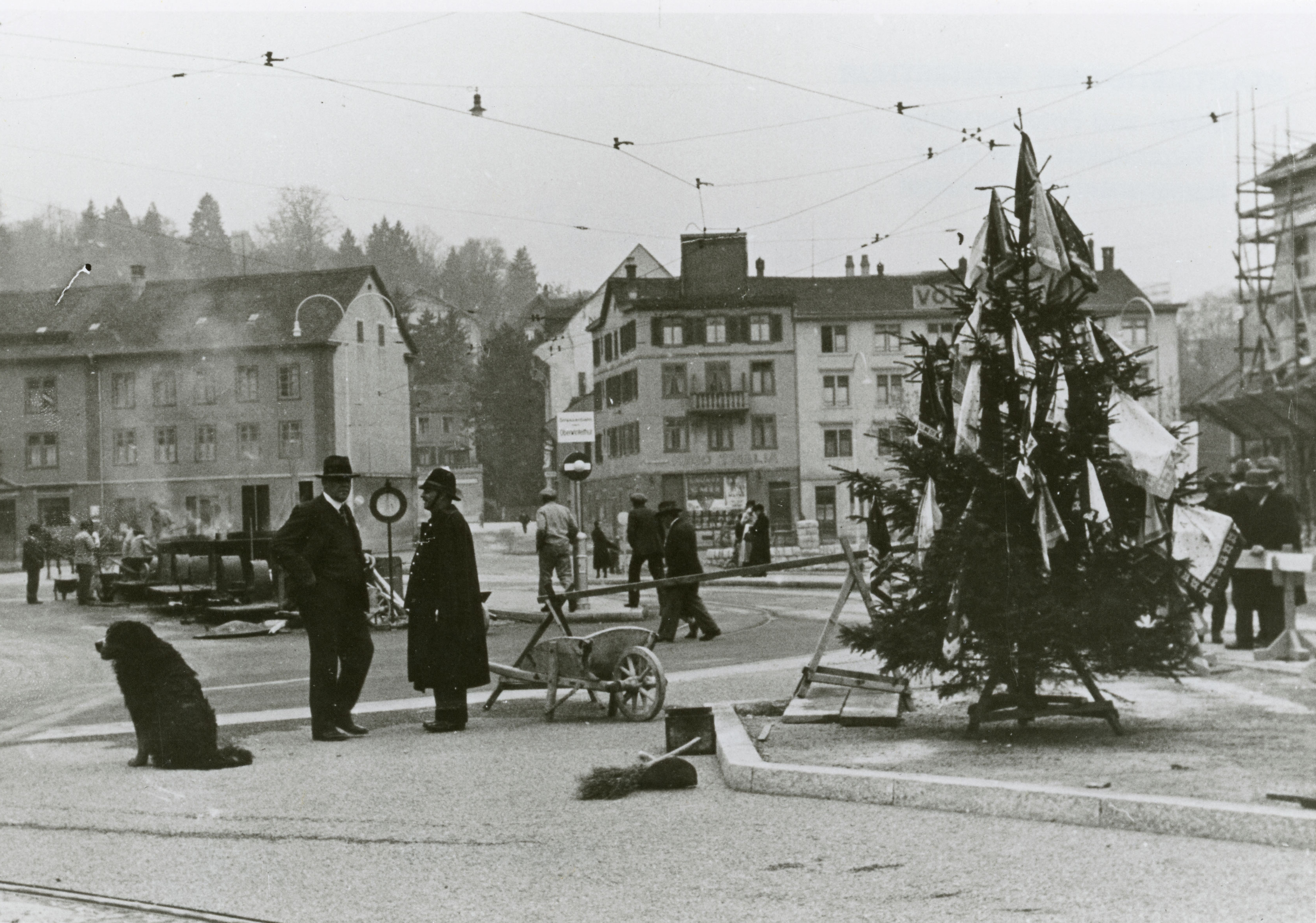 1935: Bahnhofplatz, Umbau, Pflästerer Schaffroth mit Hund