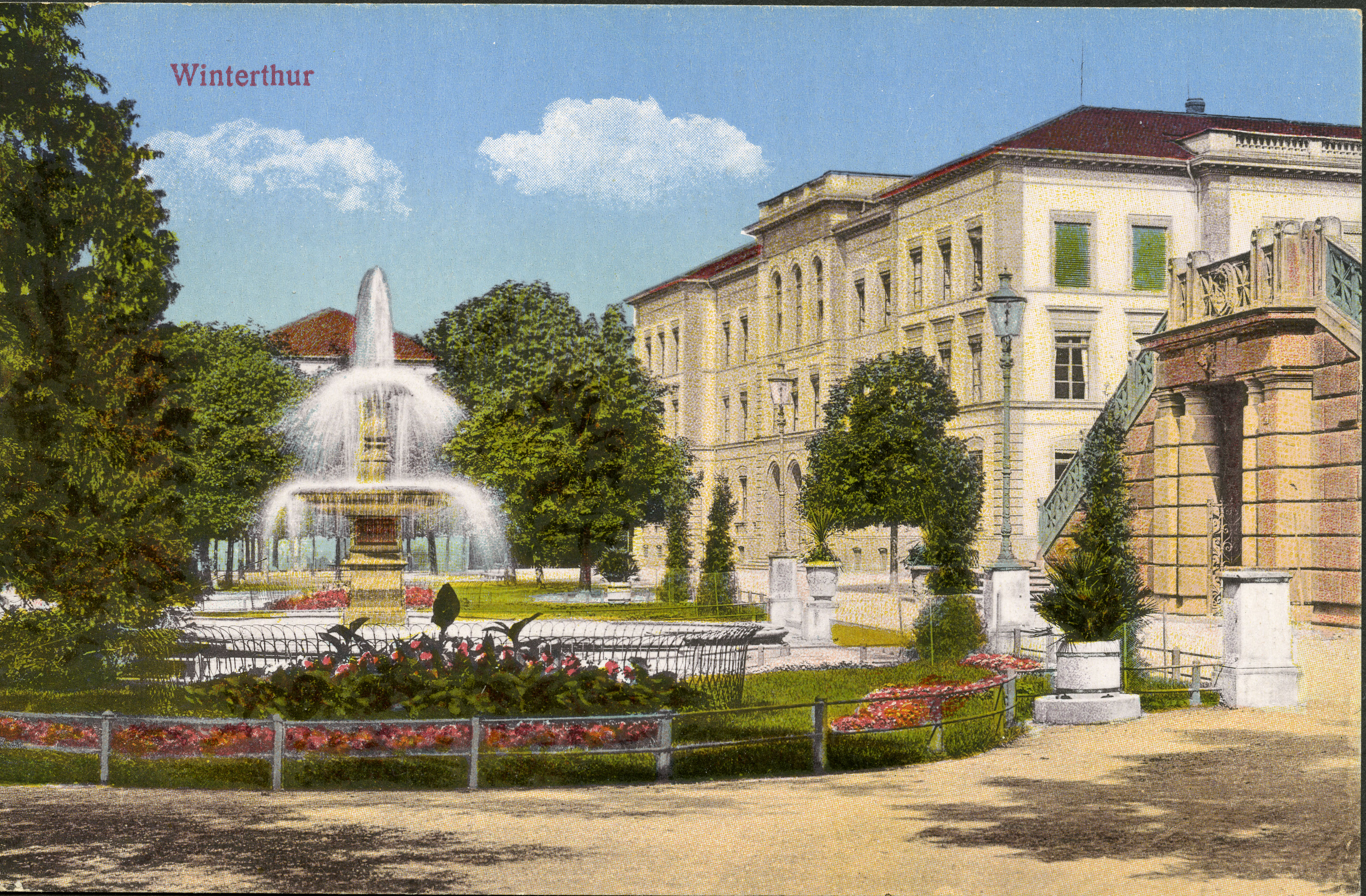 1900er-Jahre: Schulhaus Altstadt, im Vordergrund Park und Brunnen vor Stadthaus