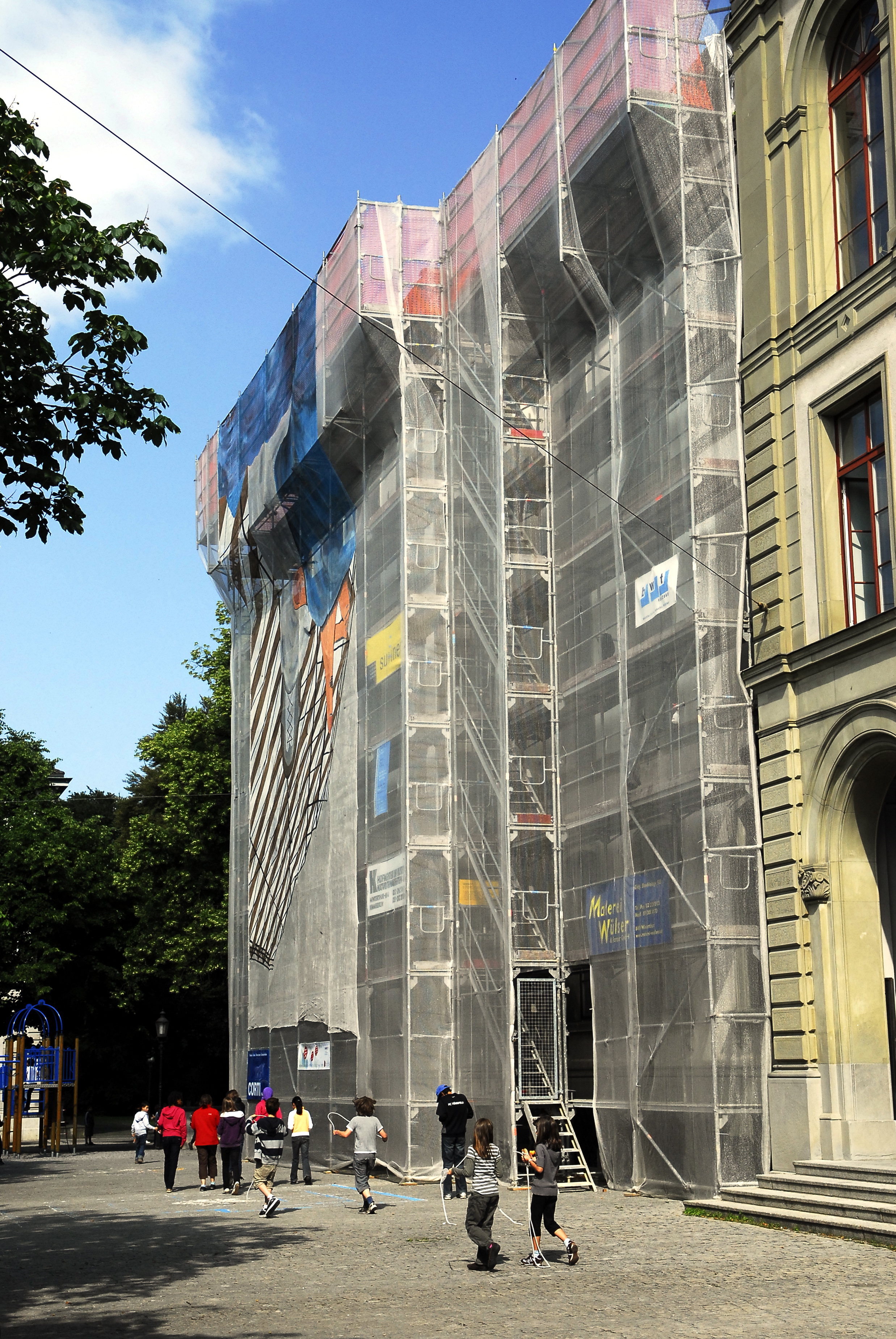 Projektbeschrieb Architekt W. Leschke Schulhaus Altstadt Winterthur 2009 wurden die Fassaden restauriert. Farbgestaltung und Stil näherte sich dabei wieder dem baulichen Zustand der 1920er Jahre an. Die Arbeiten im Sockelbereich sind noch nicht abgeschlossen. Der Verputz im Erdgeschoss soll wieder eine Bossierung erhalten (Frühjahr 2010), wie es auf den historischen Fotos sichtbar ist. In den Obergeschossen wurde nur der defekte Deckputz saniert. Die Eingangsfassade aus Sandstein wurde restauriert, die aus den Zwanzigerjahren stammenden Gewände aus Kunststein wurden gereinigt und die Rolladenstürze ausisoliert. Neue Fenster mit herkömmlicher Sprossenteilung wurden eingesetzt und sandfarbene Stoffstoren angebracht. Das flache Schrägdach im Mittelbereich erhielt eine neue Bedachung mit Kupferblech. Der Estrichboden wurde mit Zellulose ausgeflockt, die Aussenwände im Untergeschoss erhielten raumseitig eine Wärmedämmung mit 60 mm Multiporplatten. Die Decke der aussenliegenden Vorhalle im Eingangsbereich musste statisch verstärkt werden. Die gesamte profilierte Gipsdecke wurde entfernt und nach Einzug neuer Stahlträger im ursprünglichen Sinne wieder hergestellt. Die Wandbilder werden im Frühjahr 2010 restauriert.