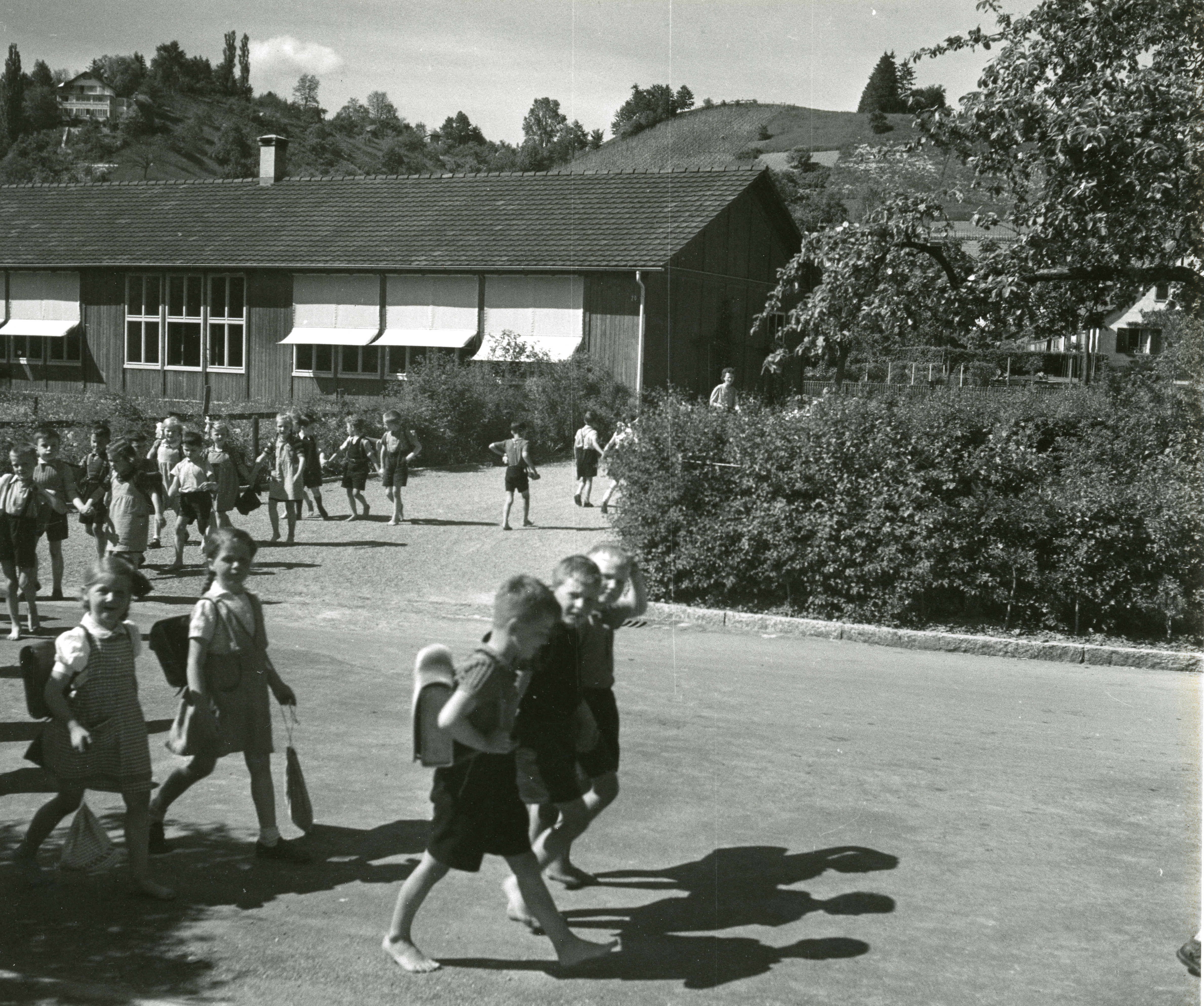 um 1950: Wiesenstrasse 20, Primarschulhaus (Provisorium), Schüler mit Schulthek auf der Wiesenstrasse