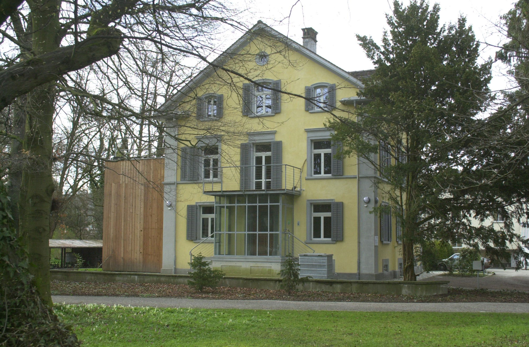 Etwas versteckt am Rande des Parkareals hinter den Schulhäusern der Berufsschulen liegt ein Zweifamilien-Wohnhaus, das heute als Bürohaus genutzt wird.