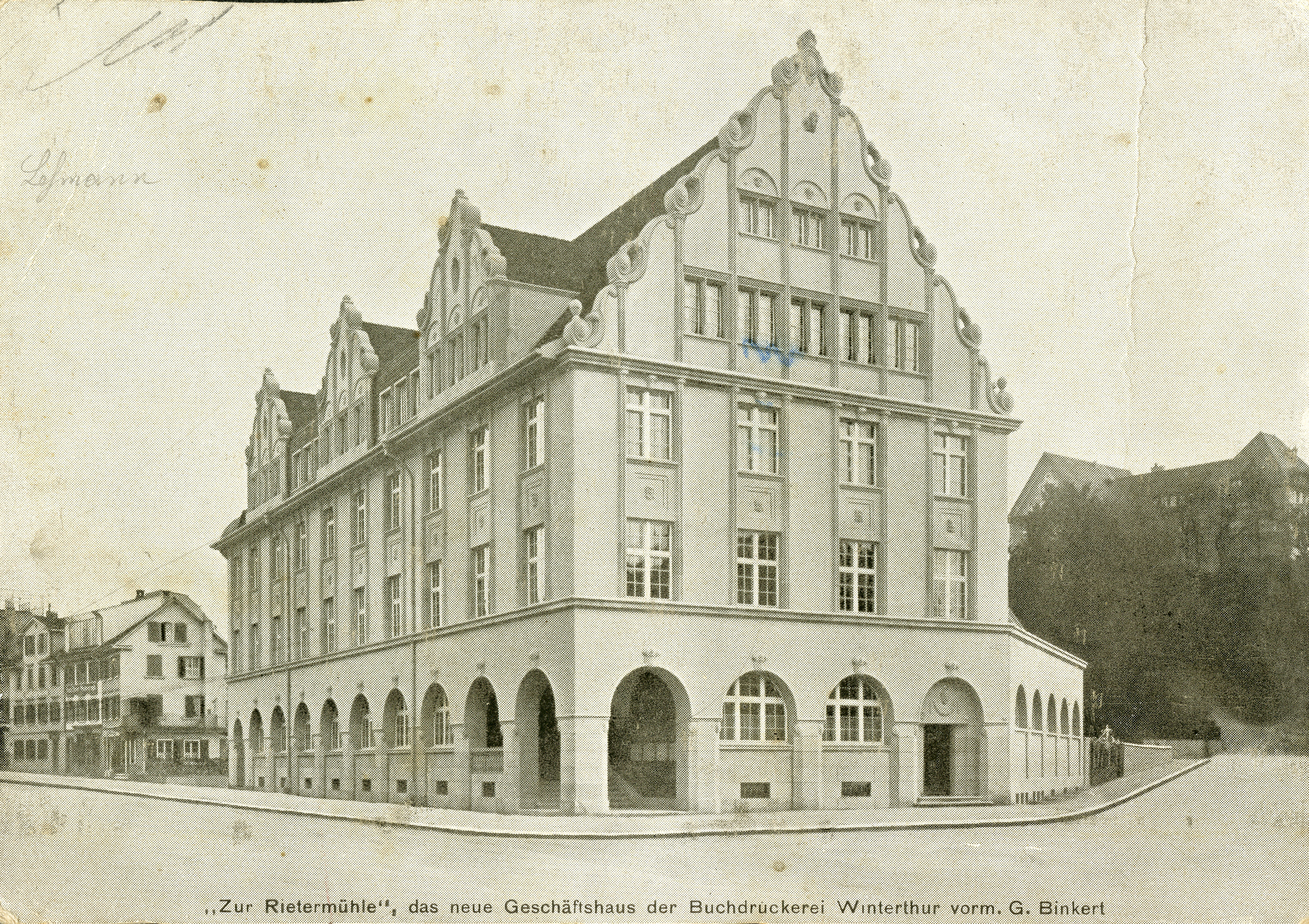 Das mit hohem Satteldach und Lukarnen versehene Verwaltungsgebäude im Jugendstil wurde 1916/17 anstelle der Rietermühle von den Architekten Bridler & Völki für die Buchdruckerei Winterthur AG erstellt. Die Obergeschossfenster werden durch vertikale Gewände zusammengefasst und das jeweils dazwischenliegende Brüstungsfeld ist mit einer stilisierten Pflanzenrosette geschmückt.