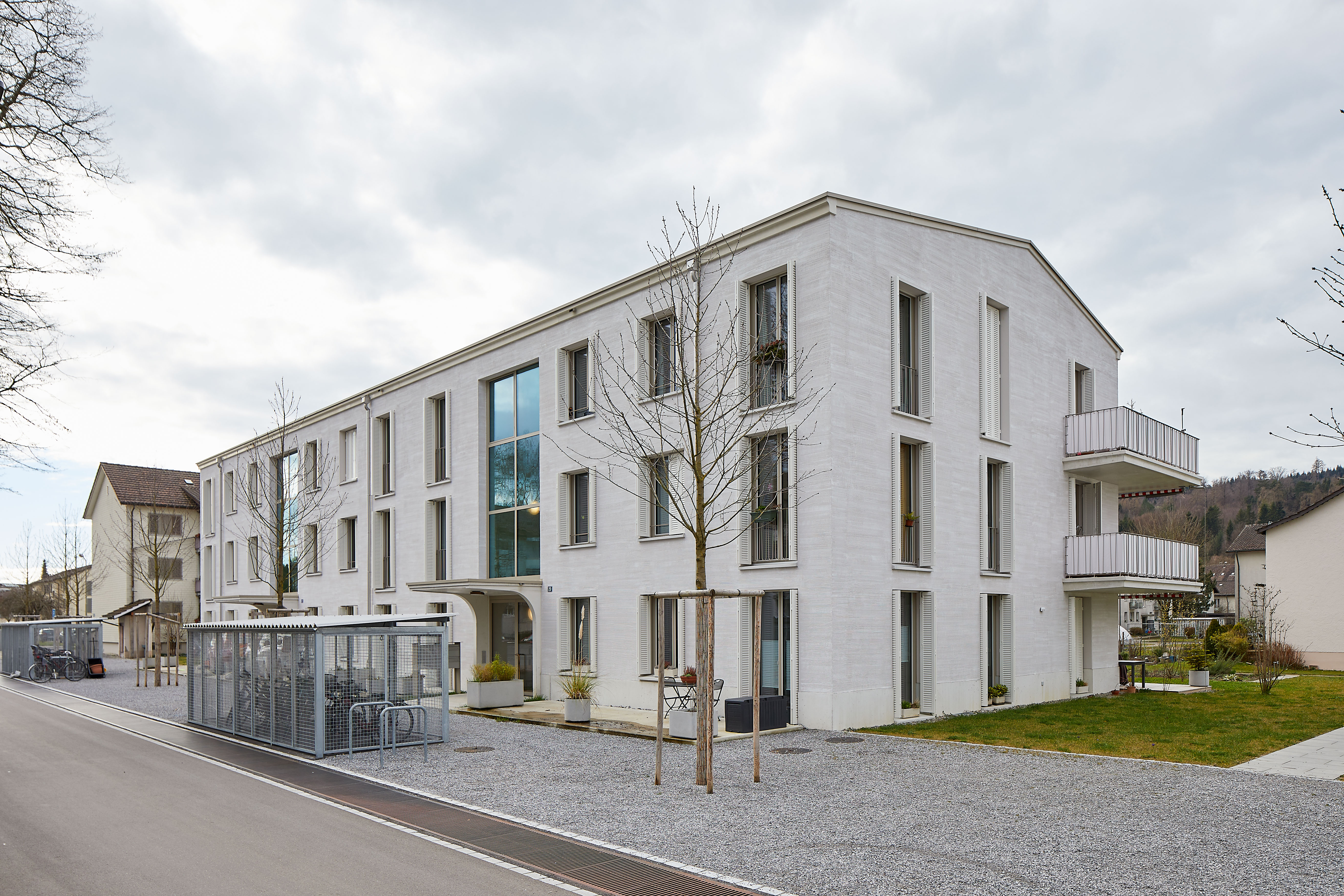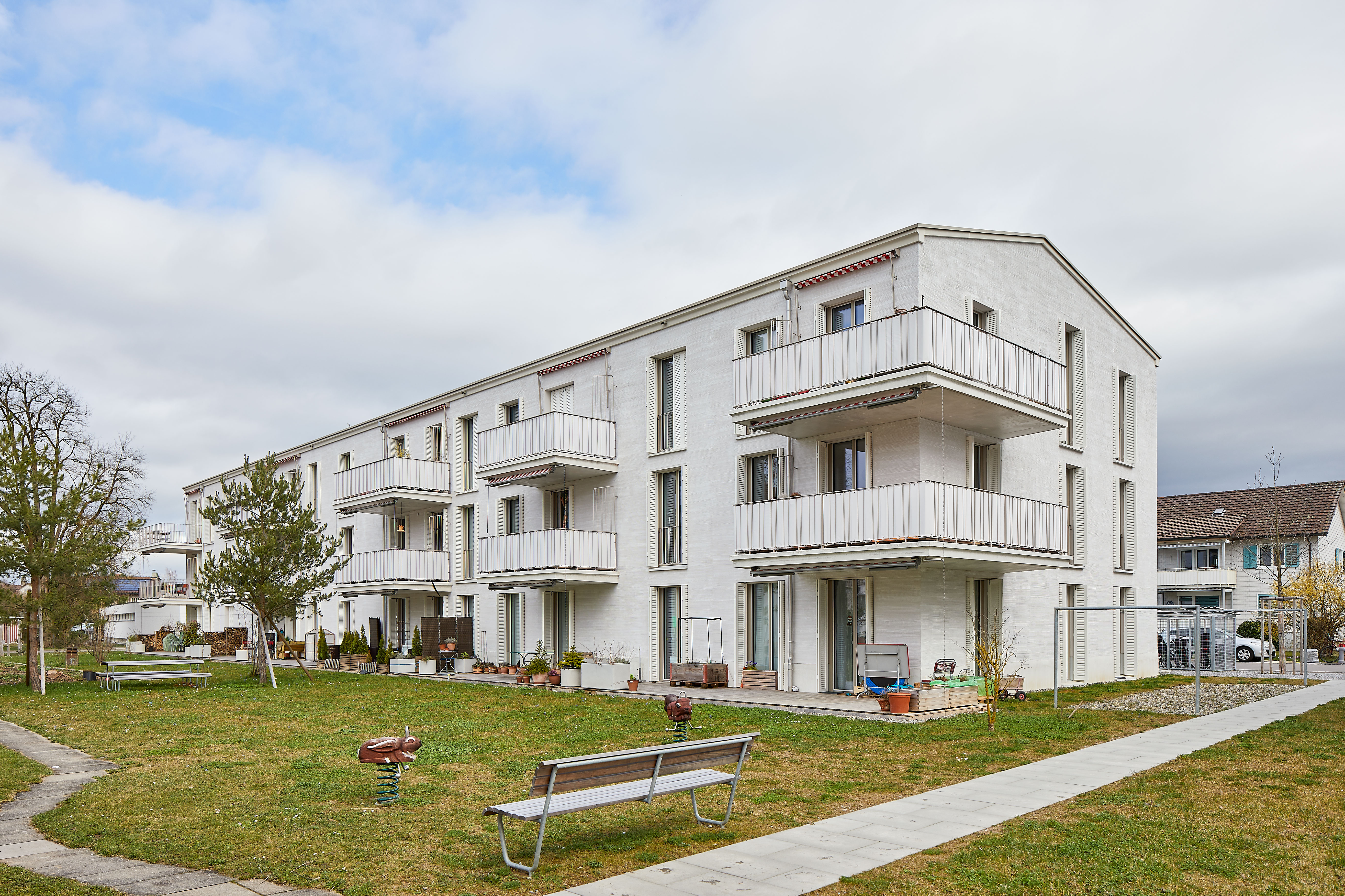 Ein zusätzliches Plus ist die umsichtige Gestaltung der Aussenräume. Kaum irgendwo sonst steht so viel Grünraum in einem dichtbesiedelten Quartier zur Verfügung. Die Grünflächen hinter den Häusern sind durch die Neubauten nicht weniger geworden, sondern wurden zu einem attraktiven Wohnpark gestaltet. Hier gibt es Luft und Raum für Kinder, Katzen und Gemüse, für Jung und Alt, für ruhige Momente im Liegestuhl, kreatives Spielen und für den nachbarschaftlichen Austausch. Wer lieber vom Balkon oder dem Sitzplatz am Geschehen teilnehmen möchte, hat einen schönen Ausblick ins Grüne, auf ein grosszügiges Gelände.“