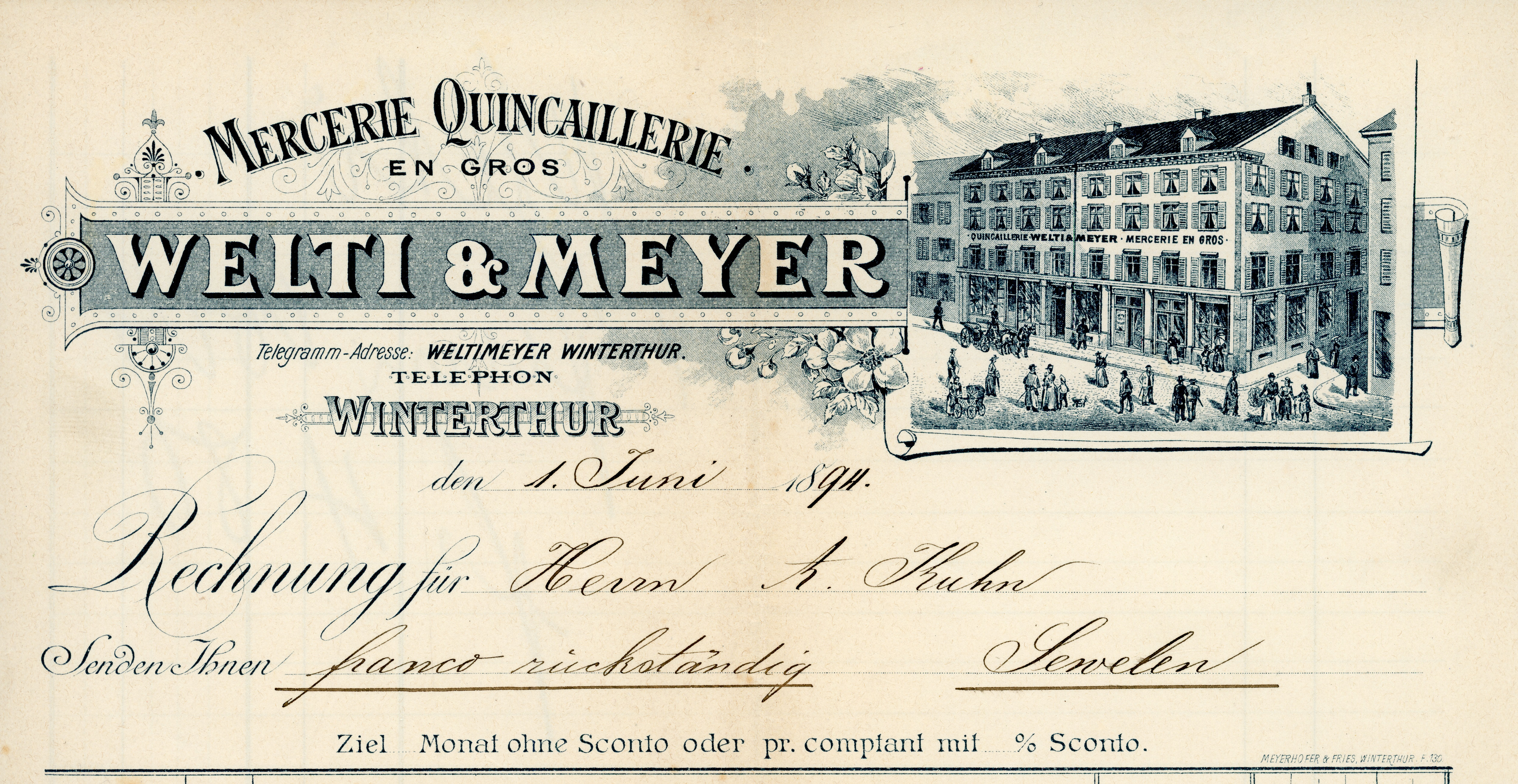 Briefkopf Welti & Meyer, Merceriewaren, mit Abbildung Ladengeschäft Marktgasse 72, roter Löwe, Rechnung, 1894