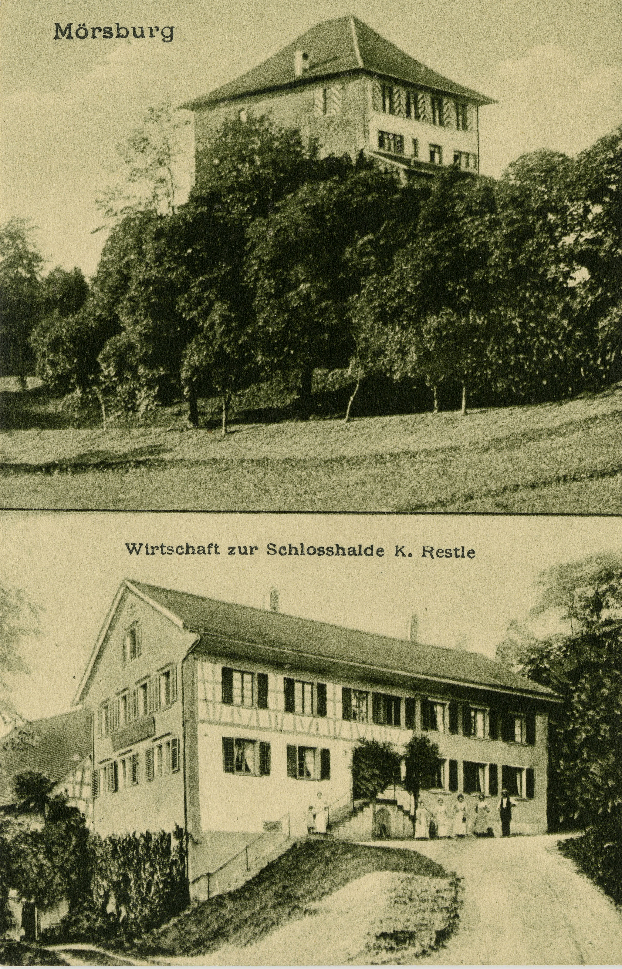 Schon früh gab es beim Schloss Mörsburg eine Wirtschaft. Das kommt wahrscheinlich daher, dass Graf Hartmann IV. von Kyburg um 1242 seinen Hauptwohnsitz zur Mörsburg verlegte und auch die Verwalter vom Meieramt und von der Vogtei Oberwinterthur manchen Bittsteller oder Missetäter begrüssen mussten, der sich nachher gerne noch mit einem Tropfen Wein aus dem nahen Rebberg stärkte. Am 13. Oktober 1425 schlichteten Schultheiss und Rat zu Winterthur einen Streit zwischen Hans von Goldenberg als Schlossbesitzer und Wirt Hans Zyminger um dessen Weinschenkrecht bei der Mörsburg. Der Schiedsspruch lautete:" Die Zyminger haben das Recht, Wein auszuschenken und die Wirtschaft zu führen, woran sie der Herr von Goldenberg nicht hindern darf. Jene aber sollten den Schlossherrn nicht mit Worten und Werken an seiner Ehre verletzen, ansonsten sie des Weinschenkrechtes verlustig gehen". In der ersten Hälfte des 19. Jahrhunderts wurde auch im Turm selbst gelegentlich gewirtet. J.C. Troll beschreibt 1847 im 6. Teil seiner Geschichte der Stadt Winterthur, die Burg: "als Lustort, als Spender einfacher Naturfreuden, wo an heiteren Tagen die freundlichsten Ansichten zu gewinnen, Einsicht in die Weinflasche, Durchsicht der nahrhaften Tätigkeit einer Bauernküche, Aussicht auf die Ebenen und Höhen des Thur- und Zürichgaus und Fernsicht nach der Alpen wundervollem Riesenkranz." Erst am 12. Januar 1939 wurde die Schlosshalde von der Stadt Winterthur zurückgekauft, um die Verschandelung des Landschaftsbildes durch eine Chalet-Kolonie zu verhindern.