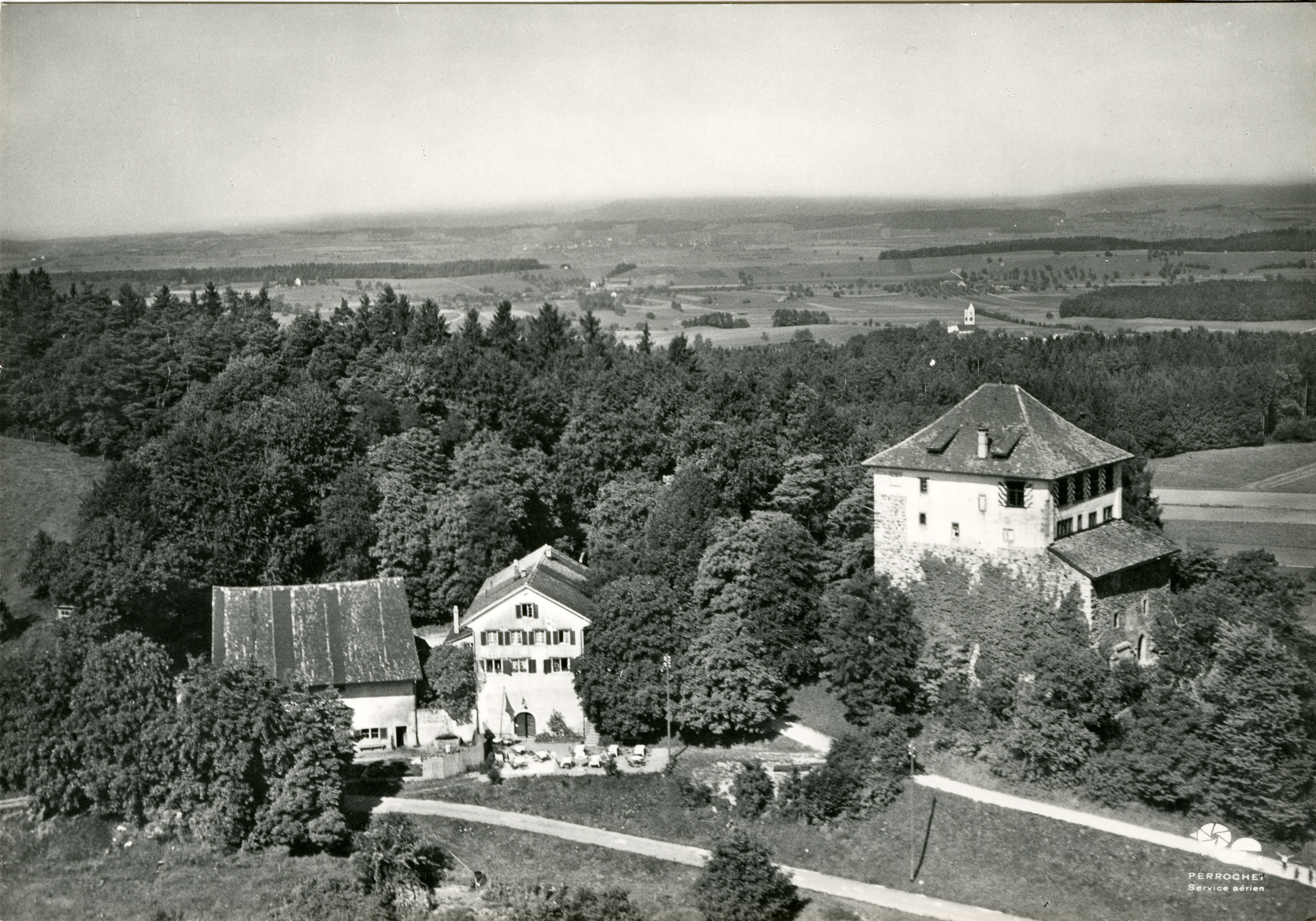 1930er-Jahre: Schloss Mörsburg, Luftbild mit Restaurant Schlosshalde (Fam. Werner)